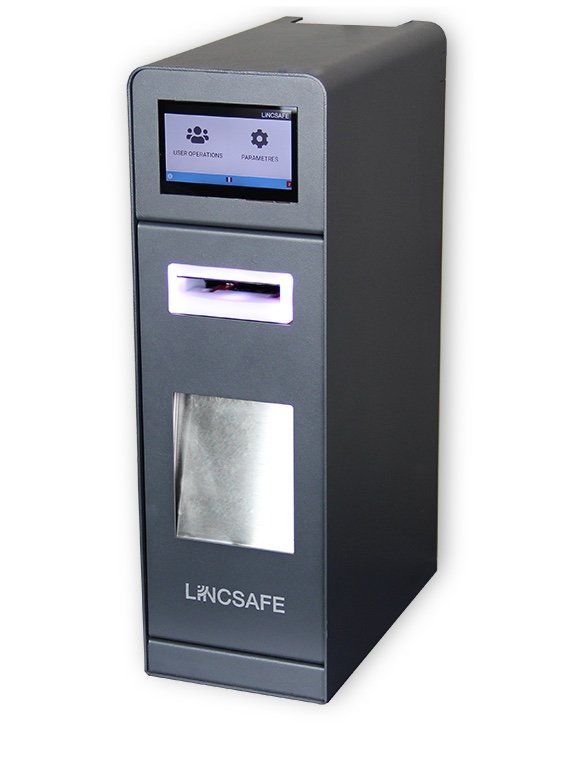 Kleiner und einfacher Abschöpftresor zum Aufstellen an der Kasse mit einem Fassungsvermögen von 600 Banknoten.