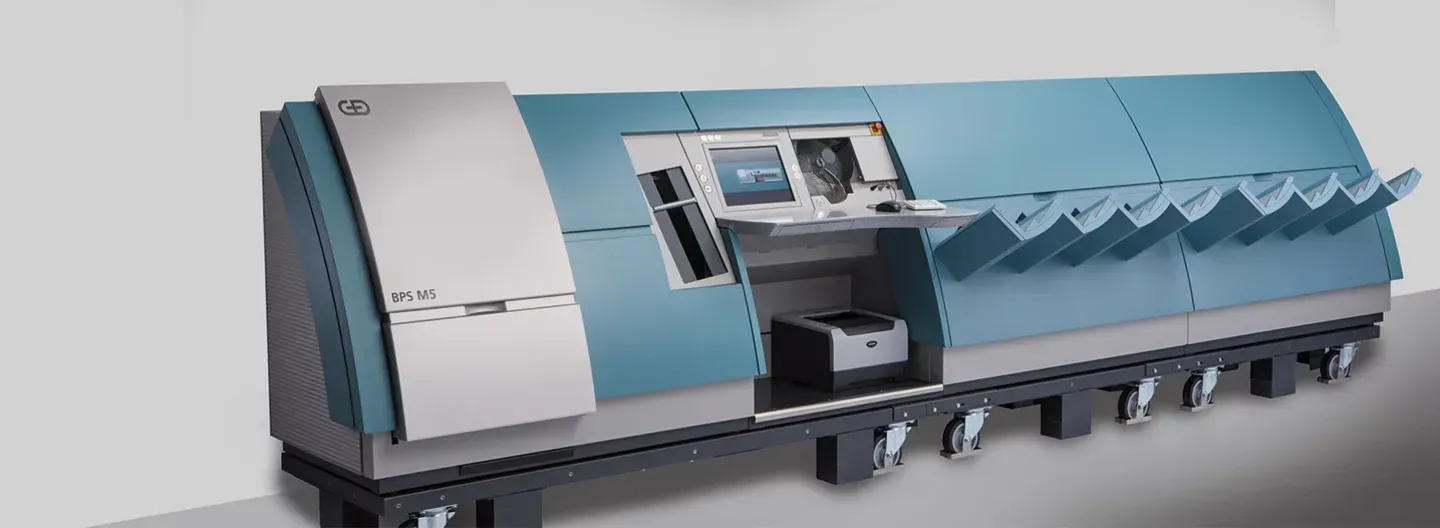 Die BPS® M5 ist das System für kommerzielle Anwendungen in G+D's Highspeed-Welt und bietet die perfekte Lösung für die Banknotenbearbeitung, insbesondere bei hohen Volumina. Als Nachfolgerin der BPS® 1000 mit über 1.400 Installationen weltweit verarbeitet sie gemischte Stückelungen von Banknoten unterschiedlicher Formate und Substrate. Dabei erreicht das System eine Geschwindigkeit von bis zu 33 Banknoten pro Sekunde (rund 120.000 pro Stunde) – auch im Dauerbetrieb: 24 Stunden am Tag, sieben Tage die Woche. Innovative und intelligente Automatisierung rund um die BPS® M5 machen sie zur perfekten Lösung für grenzenlose Produktivität bei höchster Sicherheit: Dank der Kombination mit NotaTray® Loading und NotaPack® 10 können Bearbeitungs- und Leerlaufzeiten deutlich reduziert werden.