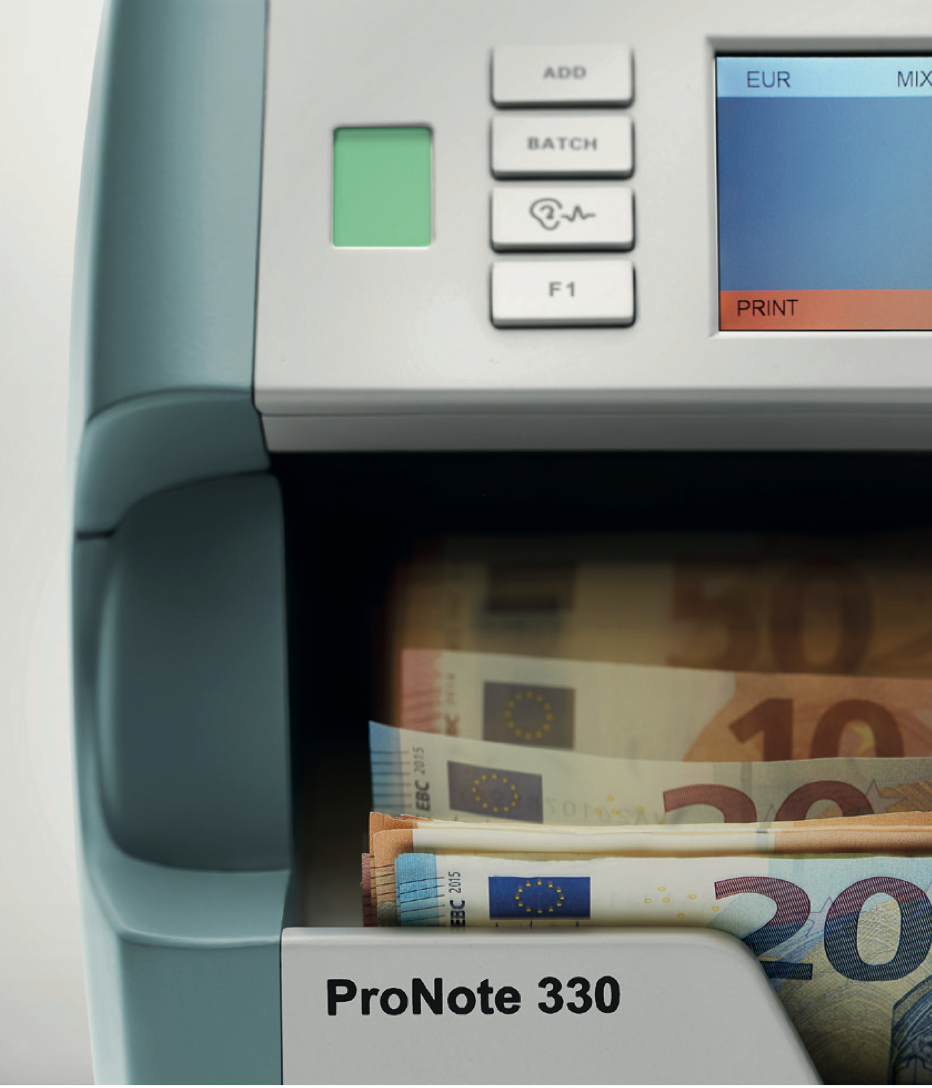 Die ProNote® 330 kombiniert höchste Zählgeschwindigkeit mit modernster Technologie und kompakter Bauweise. Dieses leistungsstarke Gerät ermöglicht eine schnelle und präzise Banknotenbearbeitung – ideal für Bankfilialen, Wechselstuben und den Einzelhandel.